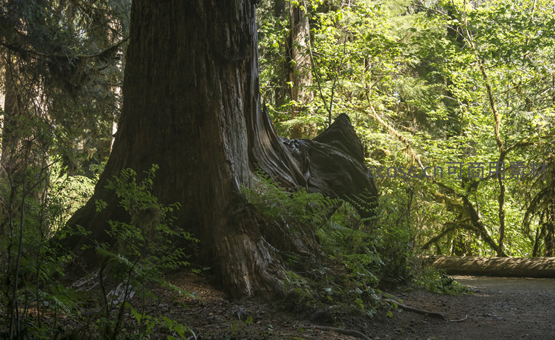 一棵古老巨树的粗壮根部在林间显露,树皮沟壑纵横,周围绿植环绕,展现出大自然的力量与岁月的痕迹。
