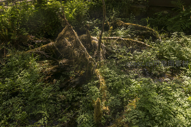 清澈小溪旁,盘根错节的树根被浓密的绿色苔藓包裹,在阳光照射下显得生机勃勃,周围环绕着各种低矮的湿润植物,充满原始野趣。