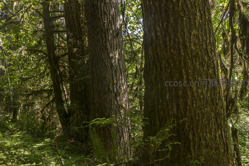 两棵巨大古树并肩而立,粗糙的树皮上布满岁月痕迹和青苔,阳光从树叶缝隙间穿透,照亮了树干和脚下的蕨类植物,营造出静谧氛围。