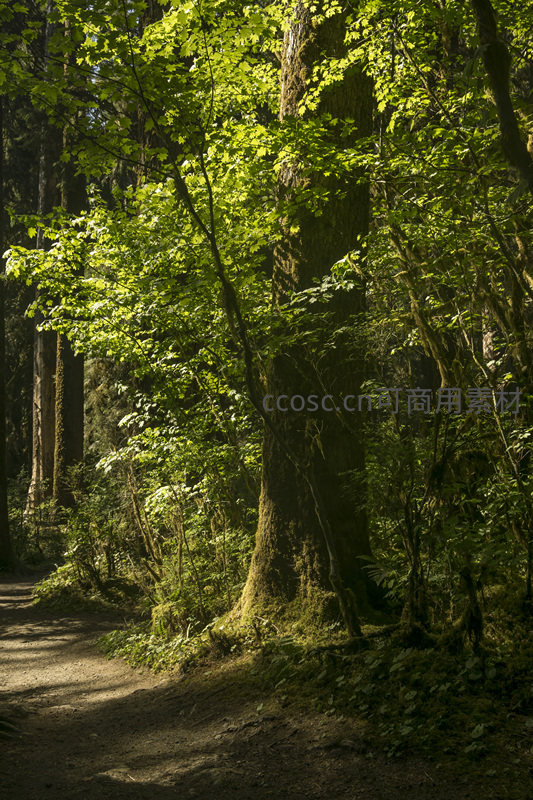 林间小径旁沐浴阳光的树木