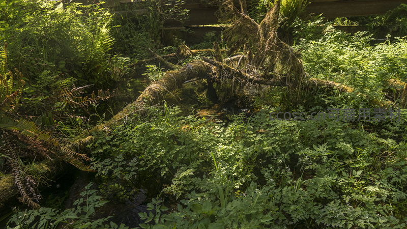 一座木桥横跨在潺潺溪流之上,桥下盘绕的树根被厚实的苔藓覆盖,周围是茂盛的水生植物和蕨类,阳光洒落,构成一幅宁静的自然画卷。