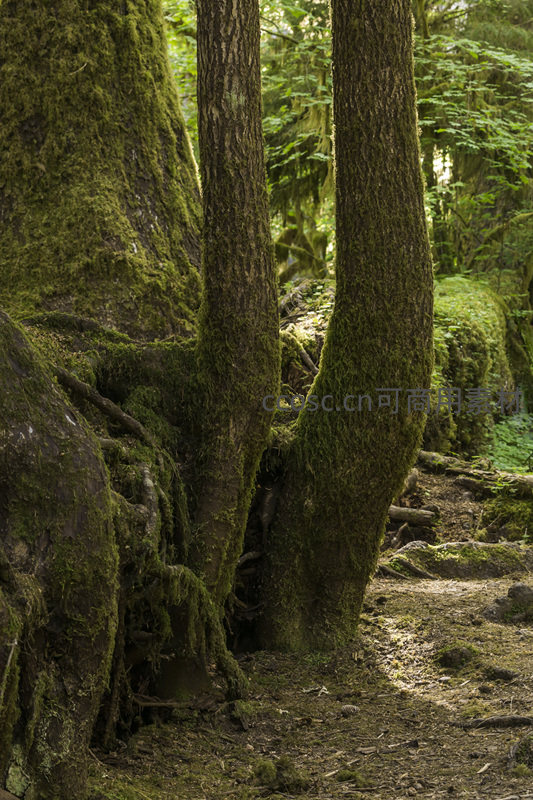 古老的森林中,巨大的树干被厚厚的绿苔覆盖,盘根错节的根系在湿润的土地上延伸,营造出原始而神秘的自然氛围。