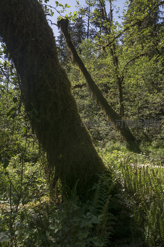 明媚的阳光透过茂密的树冠洒落在布满青苔的树干和翠绿的蕨类植物上,形成斑驳陆离的光影,展现森林深处的生机与宁静。