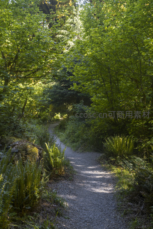 一条铺满碎石的小径在郁郁葱葱的森林中蜿蜒向前,两旁是繁茂的蕨类和高大的树木,阳光透过枝叶洒下,邀请人们探索自然之美。