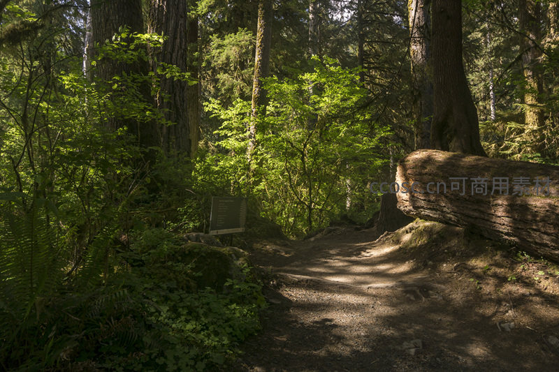 阳光斜照在林间小径上,旁边横卧着一根巨大的倒木,树皮粗糙,与周围新生的嫩绿植物形成对比,展现了森林生态的循环与生机。
