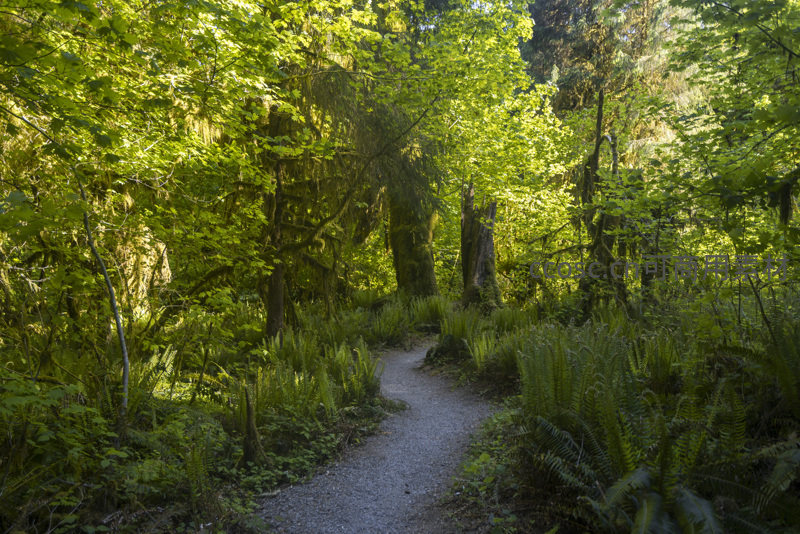 一条蜿蜒的碎石小径穿行于茂密的温带雨林中,阳光透过层层叠叠的树冠洒下斑驳光影,四周覆盖着厚厚的苔藓和繁盛的蕨类植物,营造出静谧而充满生命力的氛围。