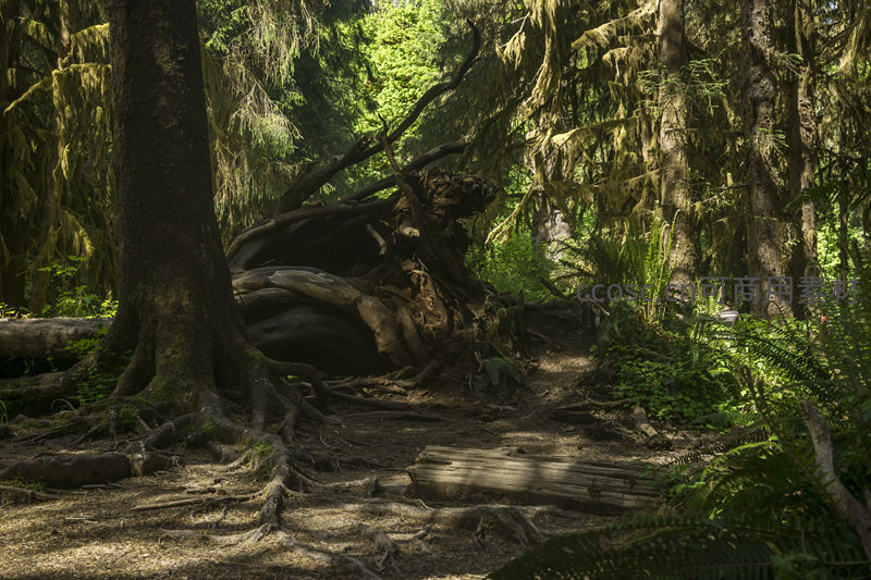 粗壮的树根如巨蟒般盘踞在地表,旁边是巨大的倒伏枯木,两者共同构成了森林中充满力量与野性的画面,展现了大自然的循环与生命力。