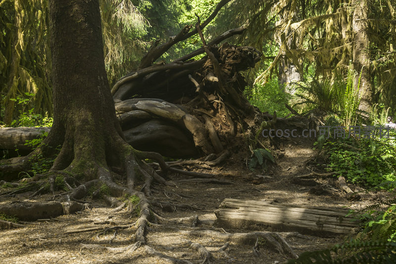 一条由裸露树根和落叶铺就的小径蜿蜒穿过古老的森林,两旁是高耸入云的参天大树和覆盖着青苔的倒木,散发着原始而宁静的气息。