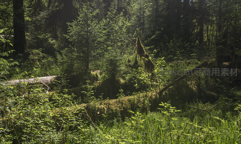 一棵巨大的倒木横卧林间,被青苔和新生植物覆盖,周围嫩绿草叶与蕨类蓬勃生长,展现森林自我更新的顽强生命力。