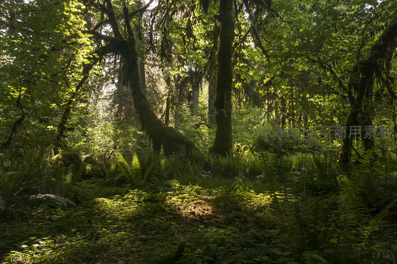 清晨的阳光如金线般穿透层层树冠,照亮布满苔藓的枝干与地面蕨类,整个森林仿佛童话世界,充满神秘与静谧之美。