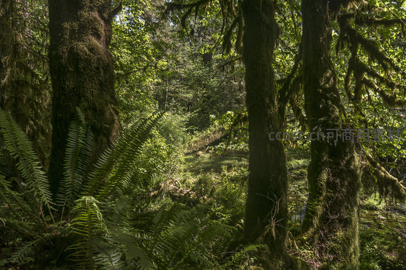 苔藓覆盖的森林深处,阳光穿透绿意盎然的树冠