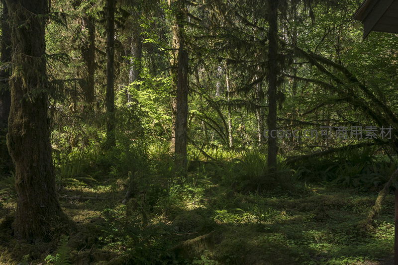 高大的针叶林投下浓密阴影,地面覆盖着厚厚的苔藓和松针,空气清新湿润,仿佛步入一个远离尘嚣、充满童话色彩的静谧森林世界。