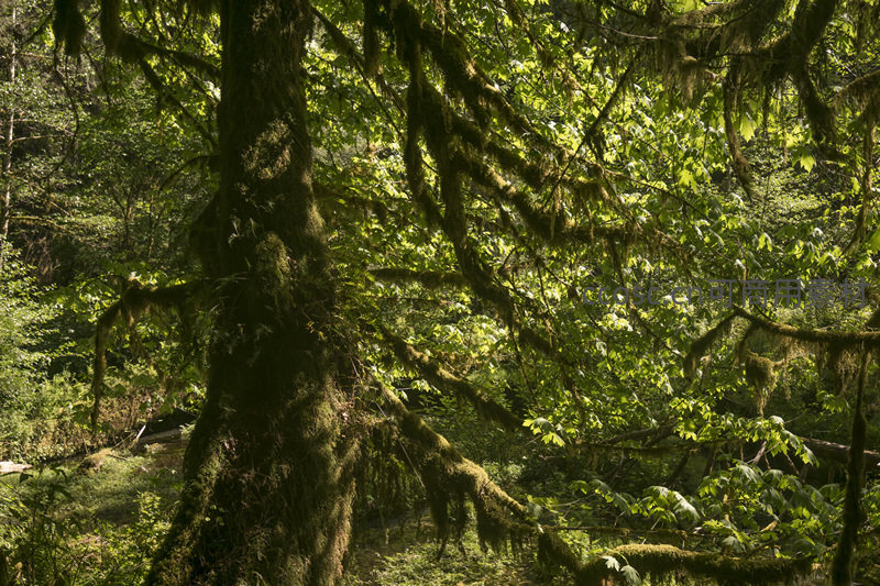 巨树盘根错节,苔藓缠绕枝桠,阳光洒落如金线