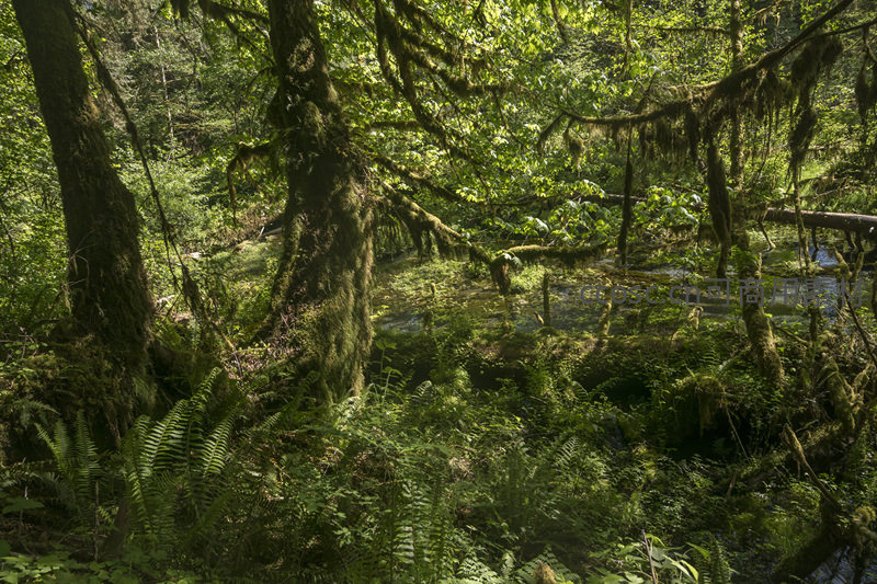古老雨林中,高大树木被浓密苔藓包裹,枝条低垂如帘幕,清澈小溪蜿蜒穿行于蕨类丛生的湿地之间,展现原始生态系统的丰饶与静美。