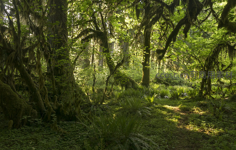 清晨阳光斜射入密林,照亮覆盖苔藓的巨树与繁茂蕨类,形成明暗交织的梦幻画面,空气中仿佛弥漫着湿润的草木清香,令人心旷神怡。