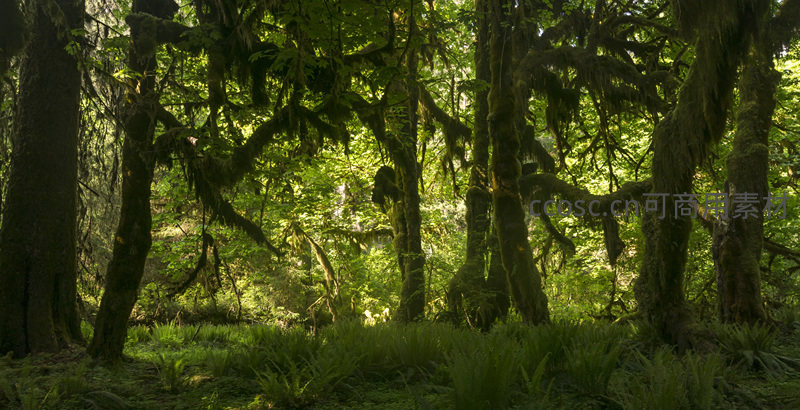 阳光透过茂密树冠,洒在布满青苔的粗壮树干与翠绿蕨类上,营造出静谧而神秘的原始森林氛围。