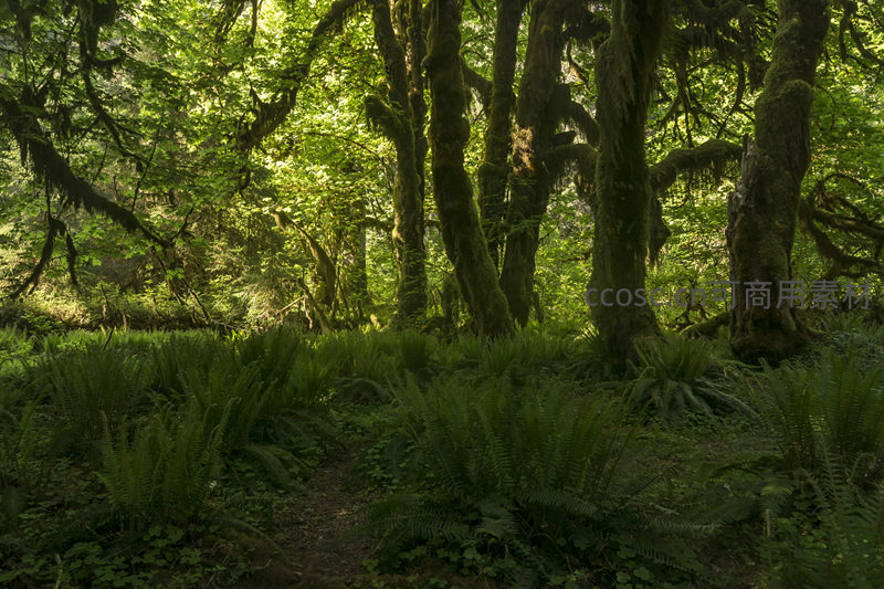 粗壮的树干上布满青翠苔藓,仿佛森林的守护者。脚下蕨类丛生,阳光温柔地洒落,整片林区弥漫着原始、纯净与安宁的气息。