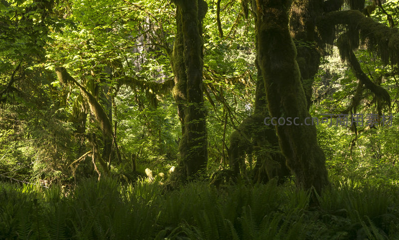苔藓覆盖巨树下的幽深林地