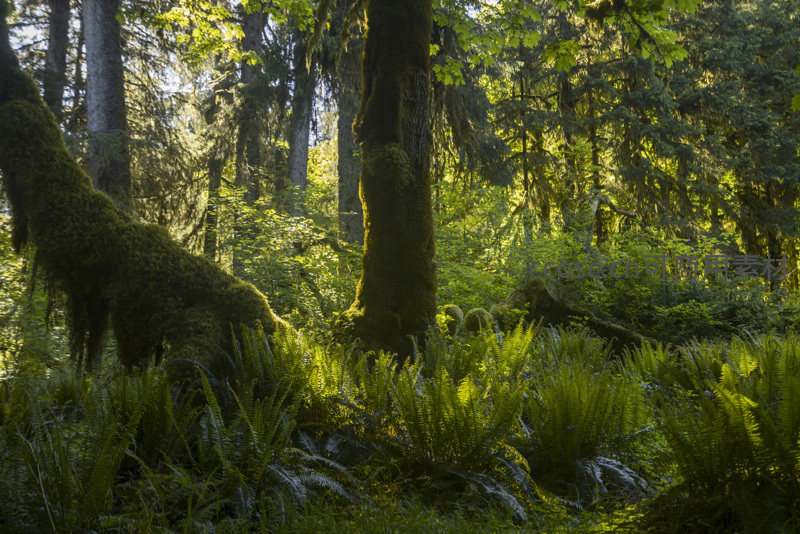 清晨的阳光斜射入幽深森林,苔藓覆盖的树干与繁茂蕨类在光影交错中显得格外生动,整个场景如同童话世界般宁静而充满生机,令人流连忘返。