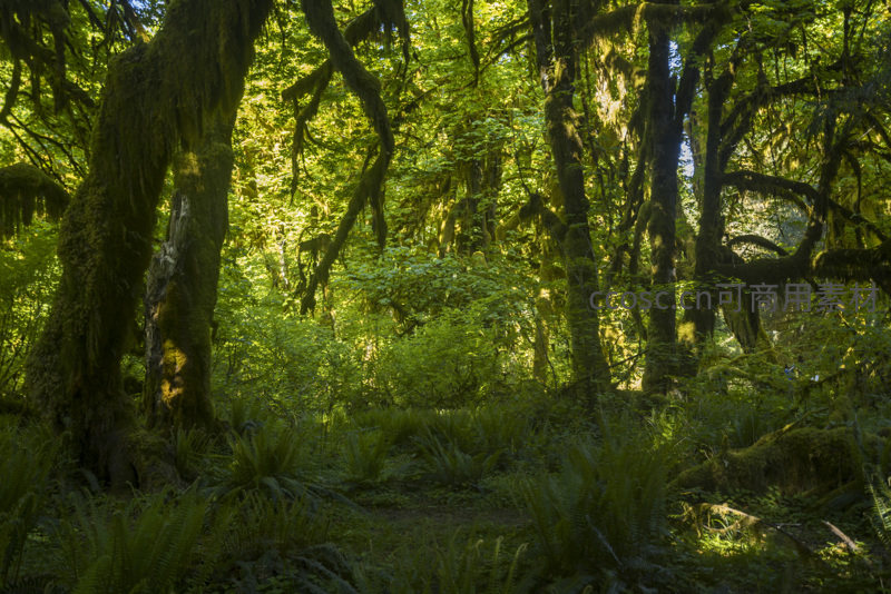 茂密的原始森林中,高大树木被厚厚的苔藓覆盖,阳光透过叶隙洒下斑驳光影,蕨类植物在林下蓬勃生长,营造出一片清新、幽静且充满生命力的自然画卷。