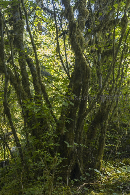 枝干交错、青苔垂挂的林间小径,阳光在叶片间跳跃形成斑驳光影,仿佛置身童话般的绿色秘境,静谧又充满生命力。