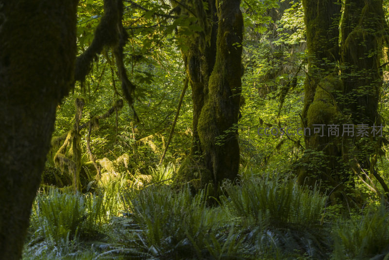 茂密的森林中,高大的树木被厚厚的苔藓覆盖,阳光透过叶隙洒下斑驳光影,营造出一片神秘而宁静的绿色世界。