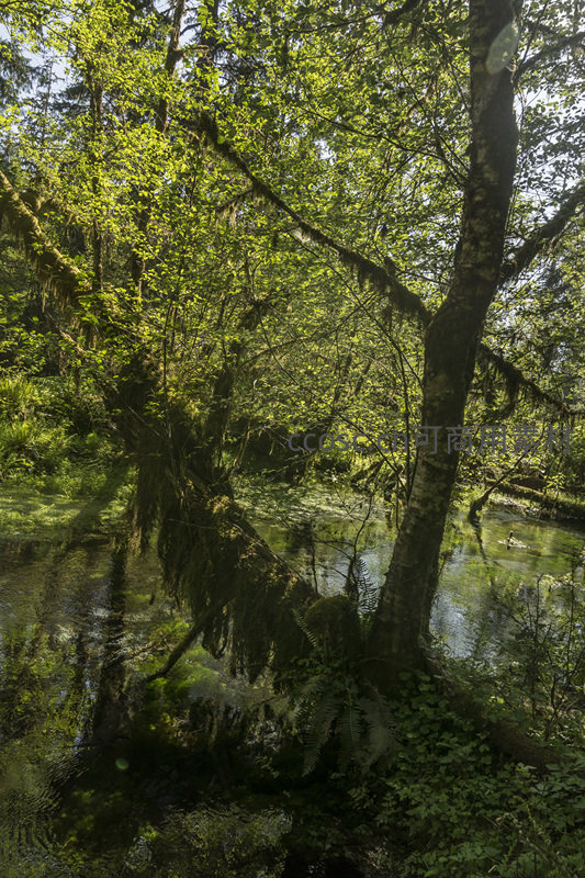 清澈溪水静静流淌,两岸树木披着青苔,枝条斜伸水面,倒影与实景交相辉映,构成一幅充满诗意的森林水景图。