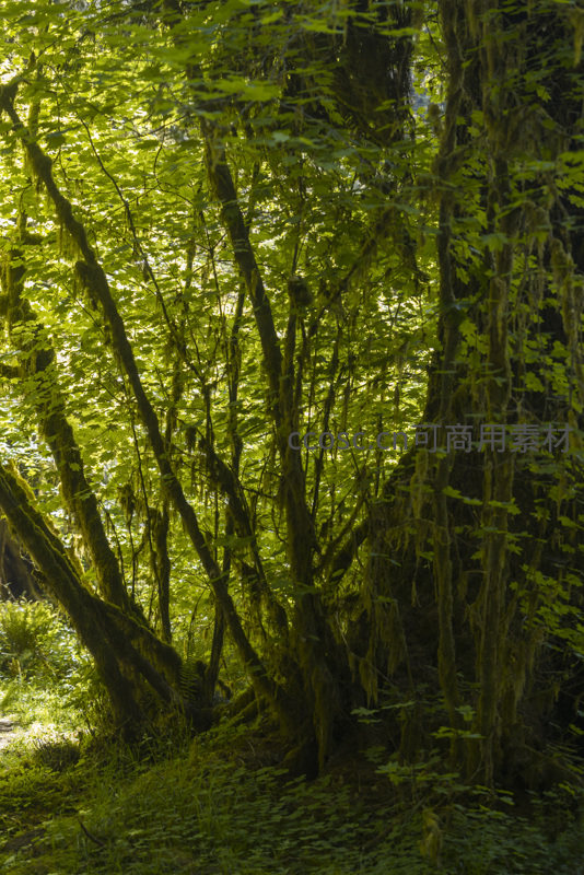 苔藓缠绕林木光影交织绿意