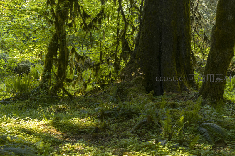 巨树根部苔藓丛生,林下蕨类沐浴晨光