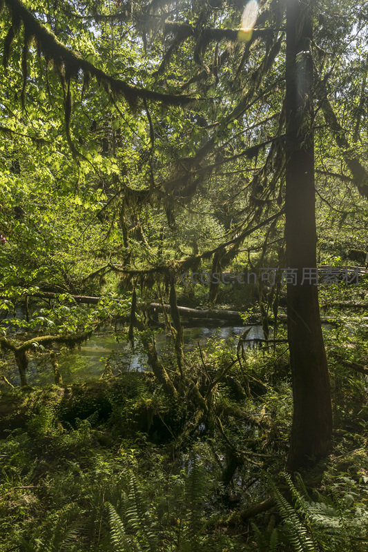 阳光穿透林冠,照亮溪流与垂挂苔藓