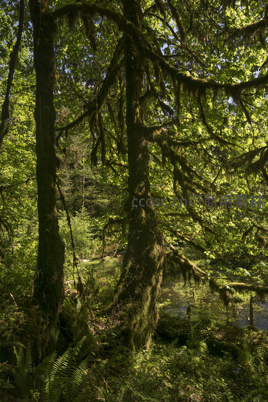 苔藓覆盖的森林巨树,阳光穿透绿意