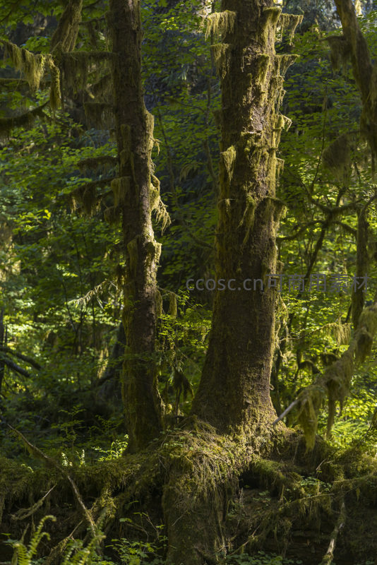 两棵巨大的树木根部紧密相连、相互缠绕,树干上爬满青苔,它们共同扎根于湿润的土壤,展现出自然界和谐共生的力量。