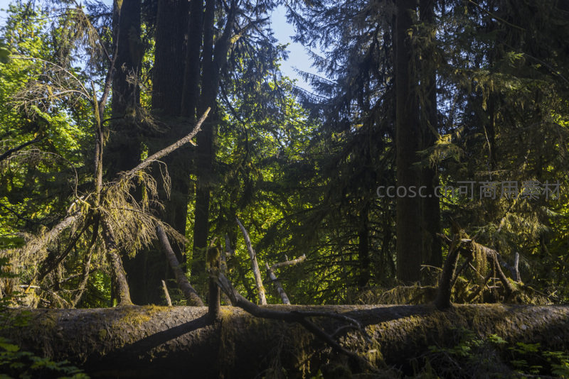 一根巨大的倒木横亘在林地中央,周围绿意盎然,阳光穿过高耸的树冠,在地面投下温暖而斑驳的光影。