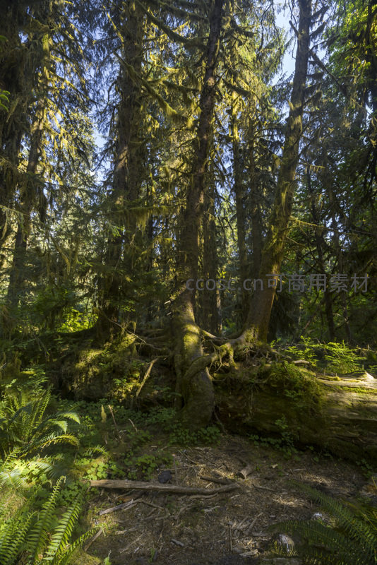 粗壮的树根如龙蛇般盘踞于地面,被柔和的晨光照亮,四周蕨类植物繁茂,展现出森林深处的生命力与静谧。