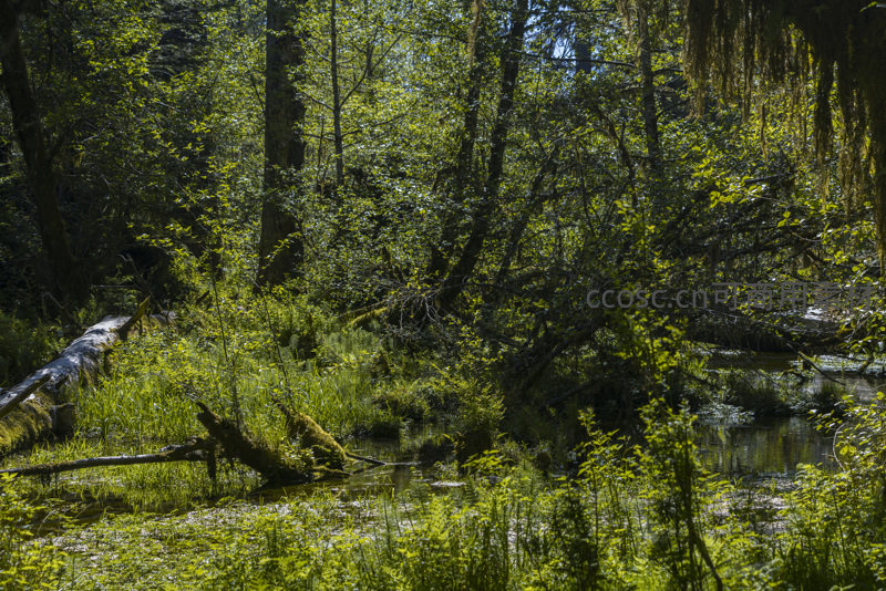 清澈水面映衬着倒伏的朽木与茂盛绿植,阳光斑驳洒落,展现湿地森林中静谧而富有生命力的生态景象。