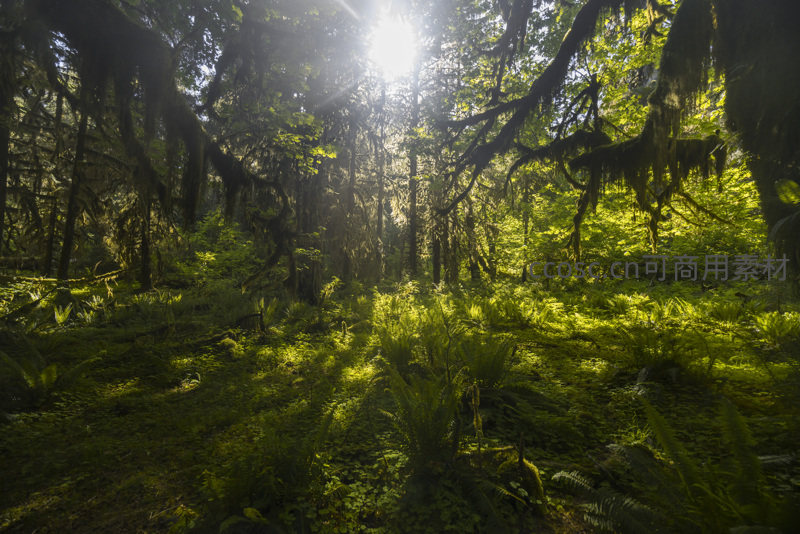 清晨的阳光穿过茂密的树冠,洒在覆盖着厚厚苔藓的林间小径上,营造出一种神秘而宁静的氛围,仿佛置身于童话世界。