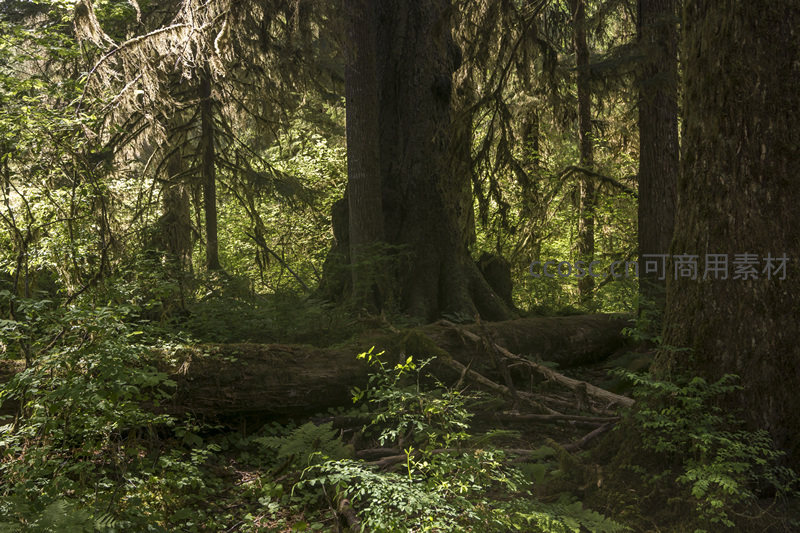 一根巨大的倒木横亘在林间空地上,周围绿植环绕,光影交错,展现了森林生态循环中自然野趣的一面。