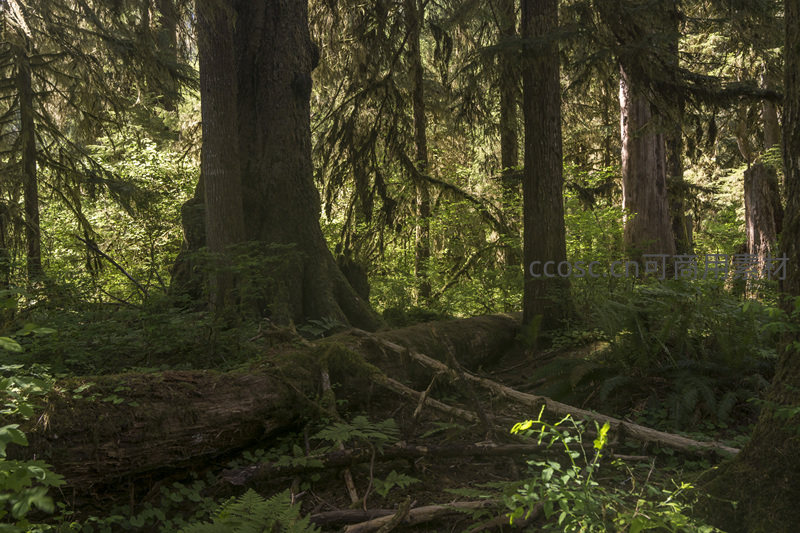 古老的倒木上覆盖着青苔,周围新生的绿植在斑驳光影中茁壮成长,象征着森林生生不息的生态循环。