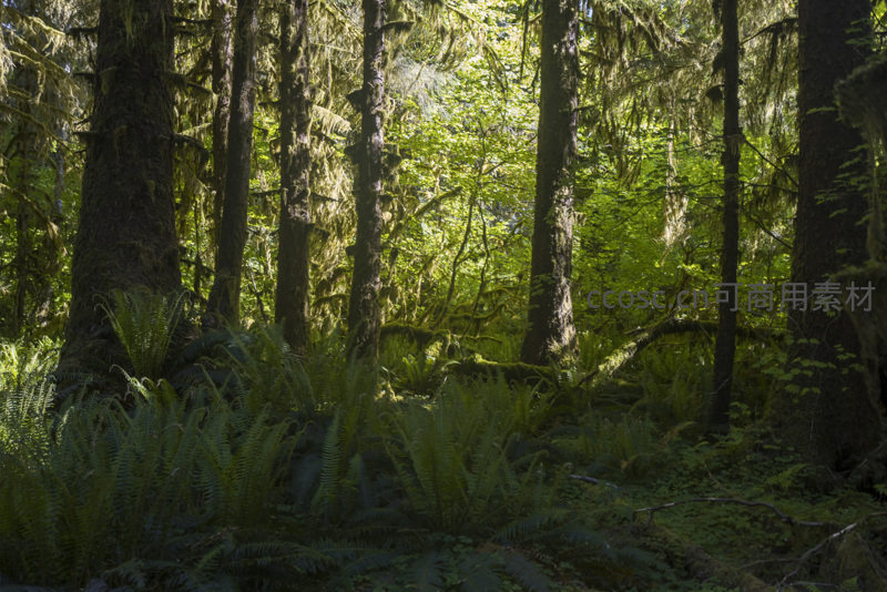 高大树木覆盖着浓密苔藓,阳光透过树冠洒在翠绿蕨类上,营造出静谧而充满生命力的原始森林氛围。
