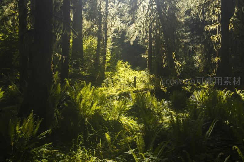 一束束金色阳光斜射入幽深林地,照亮了铺满地面的茂盛蕨类,形成明暗交错的视觉美感,令人沉醉。