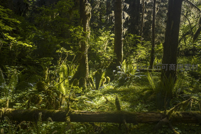 一根布满苔藓的倒木横亘于画面前景,背后是被阳光点亮的蕨类植物,构成一幅和谐共生的森林生态图景。