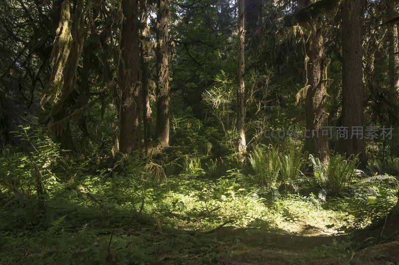 一片被阳光眷顾的林间空地,金色光斑洒落在低矮灌木与成片蕨类植物上,高大的树木静静伫立,构成一幅和谐的生态画卷。