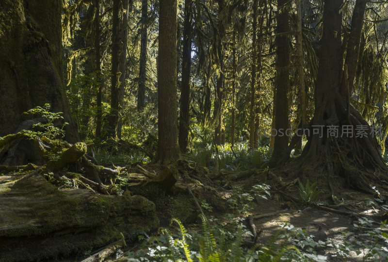 高大的树木覆盖着厚厚的苔藓,阳光透过枝叶洒在布满蕨类和树根的地面上,营造出宁静而神秘的原始森林氛围。