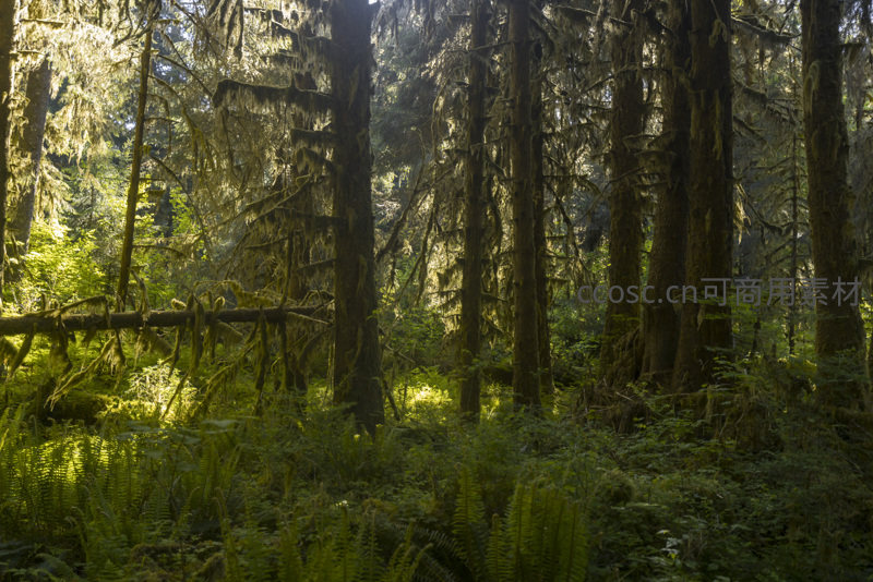 古老的树干上垂挂着浓密的苔藓,阳光从缝隙中斜射入林,照亮了地面的低矮植被,整个场景静谧而富有层次感。