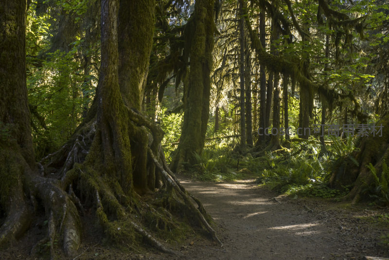 一条泥土小径蜿蜒穿过被苔藓覆盖的参天古木,阳光在林间投下温暖的光斑,引导着访客深入这片静谧而神秘的森林腹地。