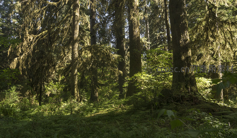 阳光在高大挺拔的树木间穿梭,斑驳的光影洒落在铺满蕨类和苔藓的林地上,呈现出原始森林特有的层次感与生命力。