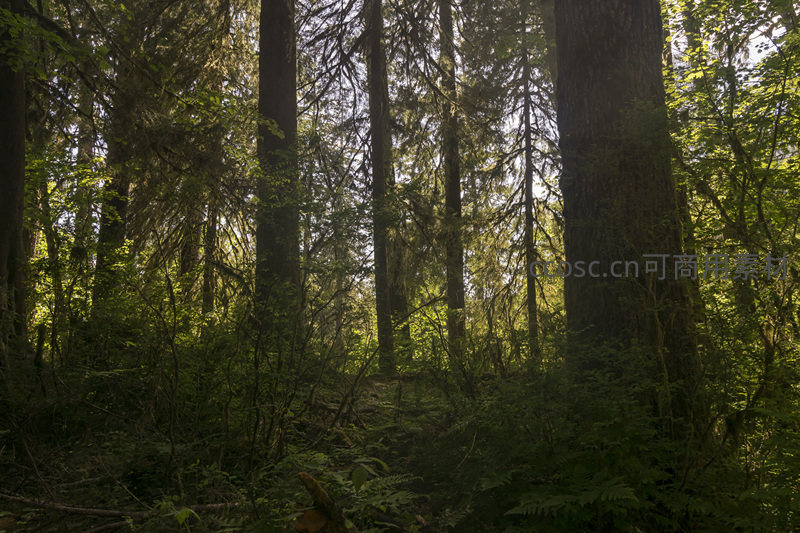 从低处仰望,高大的树木直插云霄,阳光穿过枝叶间的缝隙,形成一道道金色光柱,照亮了林间幽暗的地面,充满神圣感。
