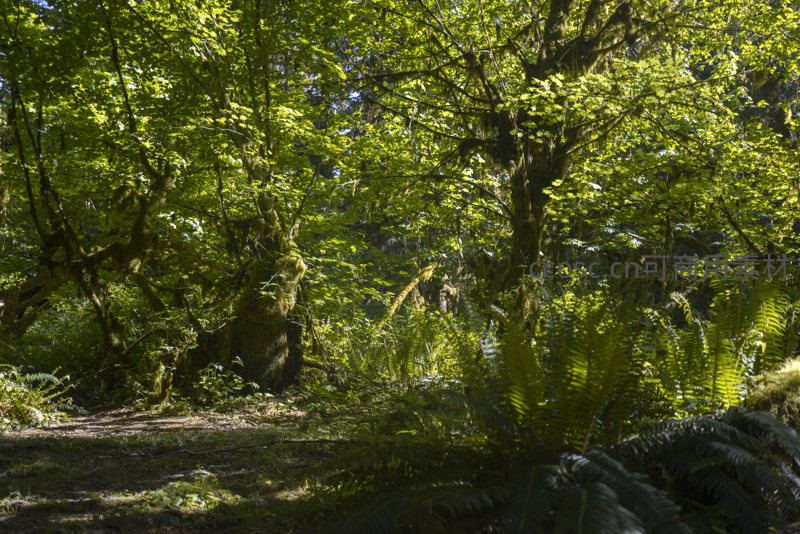 茂密的森林中,阳光透过层层叠叠的树冠洒下斑驳光影,覆盖着厚厚苔藓的古树与鲜绿蕨类植物交织,营造出一片宁静而充满生机的原始秘境。