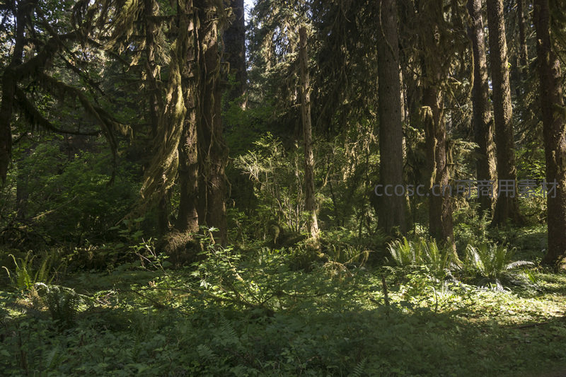 高大挺拔的树木直指苍穹,粗壮的树干与枝桠上挂满了浓密的苔藓,阳光艰难地穿透浓密树冠,在铺满落叶与蕨类的林地上投下斑驳的光点,氛围神秘而庄严。