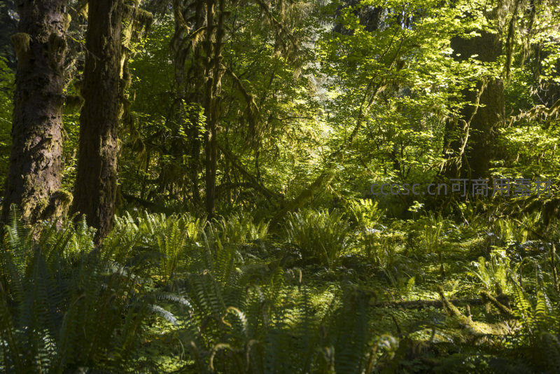 阳光穿过高大的树木,在森林地面投下斑驳的光影,四周是茂盛的蕨类和低矮灌木,展现出原始森林的勃勃生机。